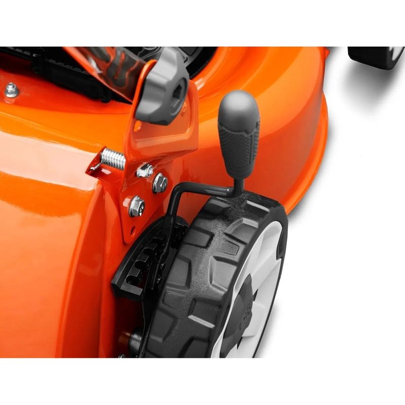 Ajuste rápido e fácil da altura do corte de grama. Uma alavanca controla toda a plataforma.