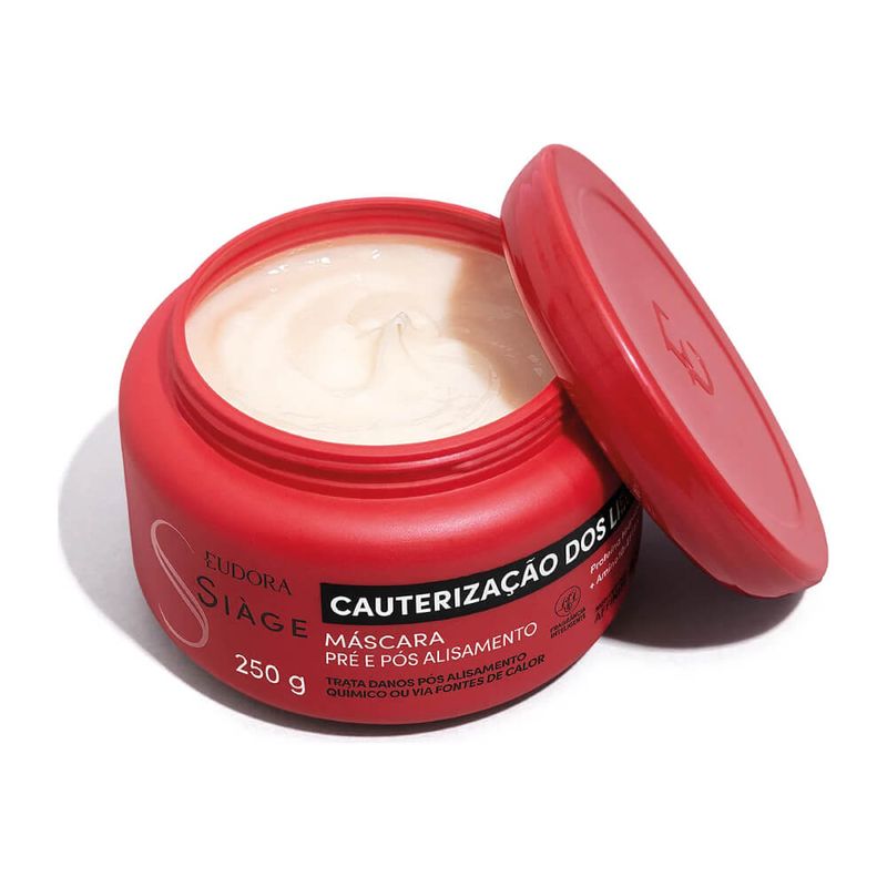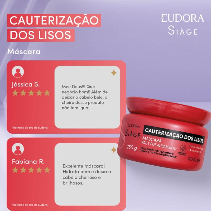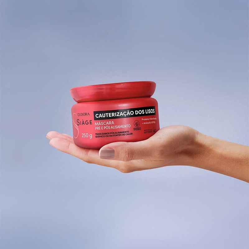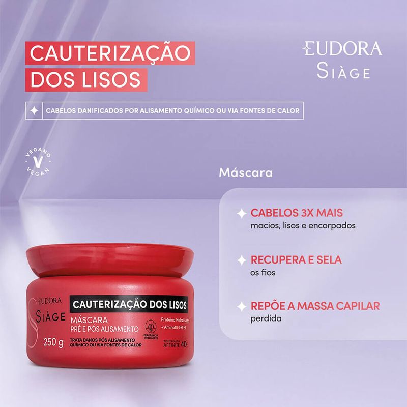 A Máscara Capilar Siàge Cauterização dos Lisos garante cabelos 3x mais macios, lisos e recuperados. Sua fórmula é rica em Amino10-effex, um blend exclusivo com 10 tipos diferentes de aminoácidos, que fortalece as fibras capilares e combate o afinamento das pontas, e Proteína Hidrolisada, que tem a função de repor os nutrientes dos fios, garantir eficiência no tratamento e protegê-los contra as agressões externas. Ideal para cabelos lisos ou alisados por processo químicos, essa máscara capilar recupera e sela a fibra capilar, enquanto recarrega os nutrientes e devolve a massa perdida, reduzindo o afinamento das pontas e garantindo cauterização ideal para os fios alisados. Além de tratar os danos pós alisamento químico ou via fontes de calor , conta com explosão de fragrância , que resiste ao calor do secador e da chapinha. Resultados pré química: Recarrega os nutrientes dos fios deixando-os mais fortes; Auxilia na proteção do cabelo pré alisamento. Resultados pós química: Preenche a fibra capilar e garante fios blindados e resistentes para o seu próximo alisamento;Repõe as proteínas essenciais do fio. Siáge Cauterização dos Lisos é resultado de salão em casa! Nenhum produto Eudora é testado em animais, ou seja, este item possui selo Cruelty Free.