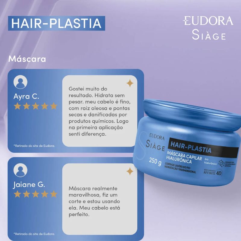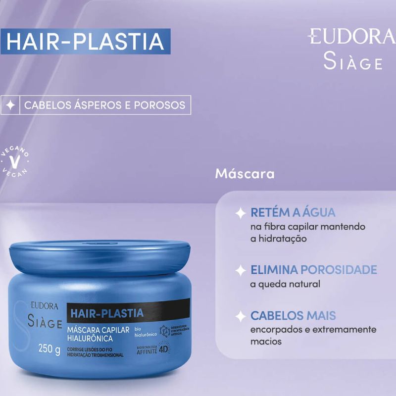 A Máscara Capilar Hair-Plastia Siàge Eudora age diretamente nos fios, promovendo uma ação hidratante tridimensional por muito mais tempo. Além disso, sua limpeza intensiva ajuda a eliminar a porosidade das madeixas, devolvendo toda a vitalidade e beleza desde o primeiro dia de sua aplicação. O resultado são fios encorpados e incrivelmente macios. Conheça outros destaques deste produto incrível: - Plástica capilar instantânea; ; - Corrige as lesões; - Exclusiva Biotecnologia Affinité 4D; - Produto cruelty free.