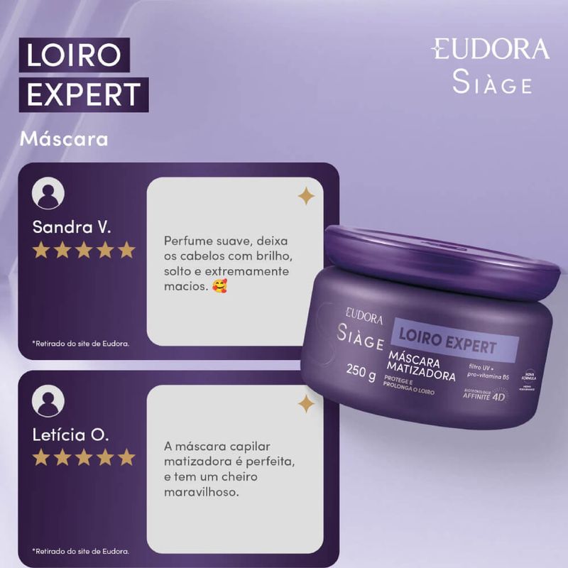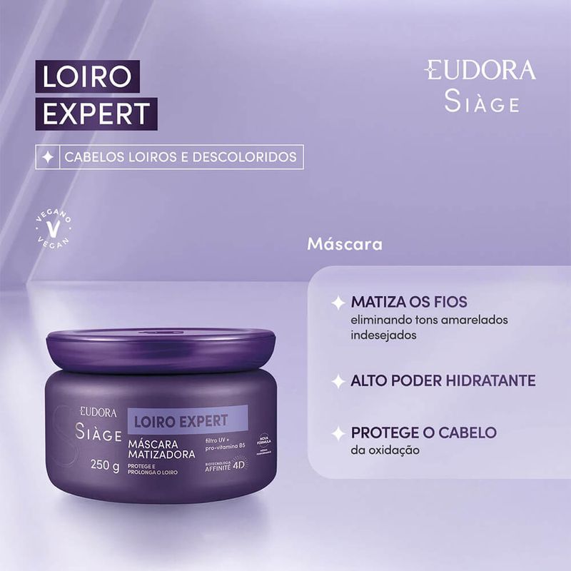 A Máscara Capilar Matizadora Siàge Loiro Expert protege o cabelo da oxidação, enquanto matiza os fios. Essa máscara matizadora possui fórmula enriquecida com Filtro UV e Pro-Vitamina B protege os cabelos da exposição diária ao sol. Com pigmento violeta, desamarela os fios sem manchar o cabelo, podendo ser usado diariamente e garantir benefícios como: -Protege e aumenta a durabilidade do loiro por até 2 meses; -Protege os cabelos contra a oxidação e alteração de tons; -Restaura a elasticidade e resistência do fio; -Repara a hidratação perdida durante a química; -Livre de Petrolatos, Parabenos e Sal. SOBRE A LINHA Uma linha completa de tratamento para quem desejar ter seus loiros iluminados e protegidos. Proporcionando mais brilho e proteção desde a primeira aplicação, Siàge oferece por meio do Loiro Expert uma cor intensa e radiante por muito mais tempo. Perfeita para cabelos com luzes, mechas ou tingidos, essa linha completa une alto poder antioxidante e hidratação para preservar a cor de cada um dos seus fios. Nenhum produto Eudora é testado em animais, ou seja, este item possui selo Cruelty Free.