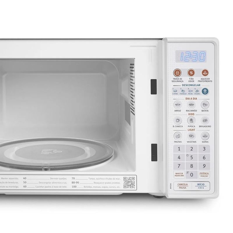 O QR Code permite que você acesse, na tela do seu smartphone ou tablet, vídeos com o passo a passo do preparo das receitas que estão no painel do Micro-Ondas. Além disso, ele possui trava de painel que evita o acionamento indesejado do aparelho e garante muito mais segurança a você e a sua família.