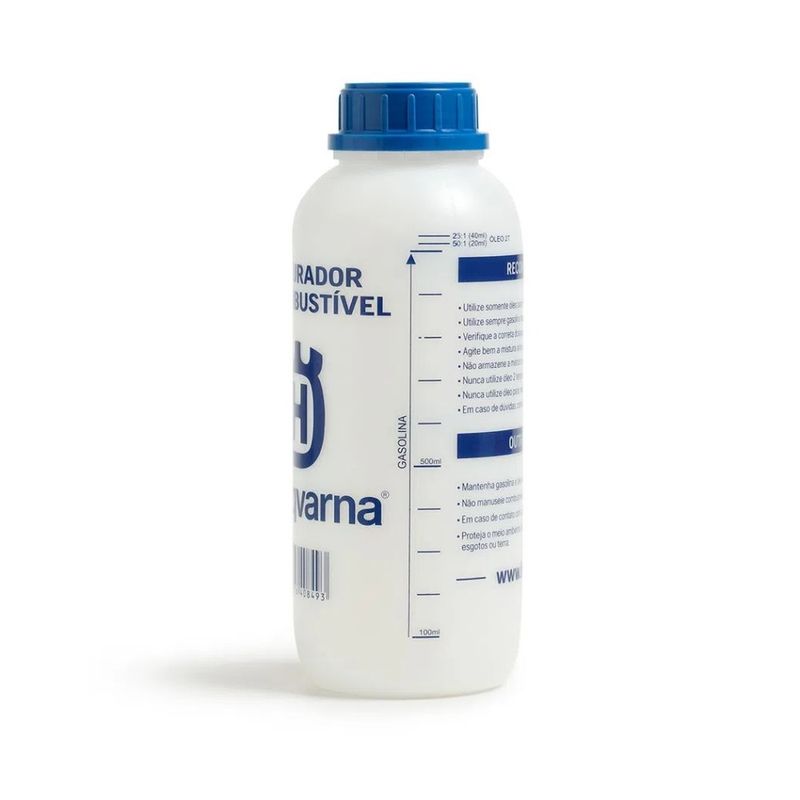 Com capacidade para 1 litro, possui também graduação lateral para gasolina e lubrificante. 50:1 e 25:1