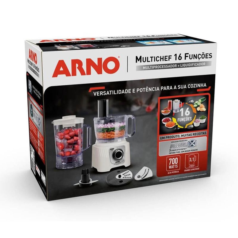 Multichef 16 funções conta com 700W de potência, 2 velocidades e 4 acessórios, permitindo picar, ralar, fatiar e liquidificar - Receitas mais práticas e rápidas com seu multiprocessador multichef Arno.