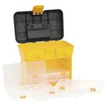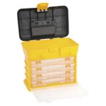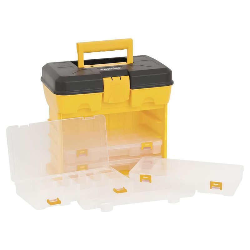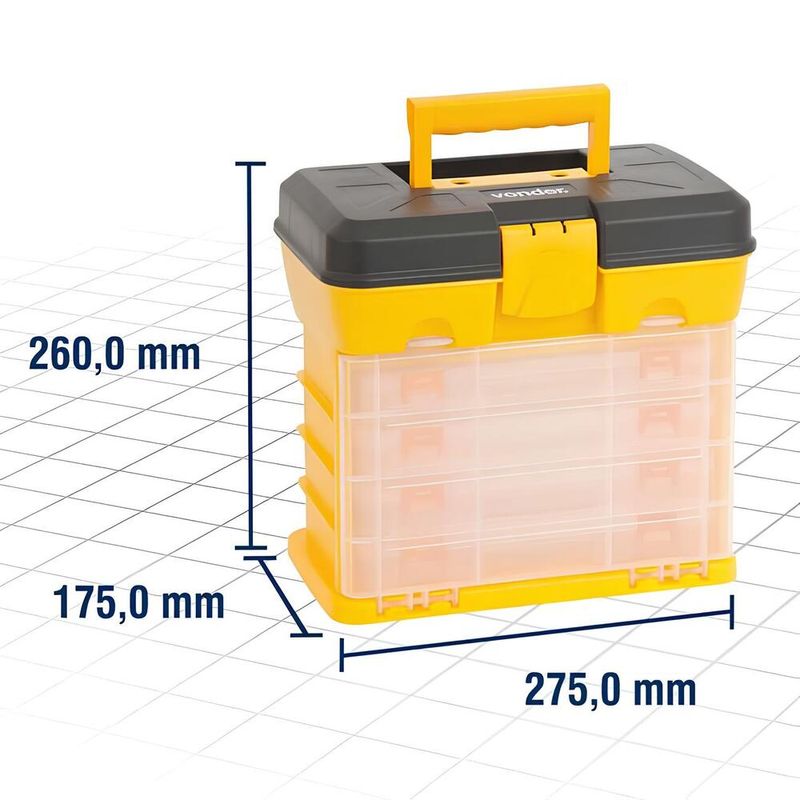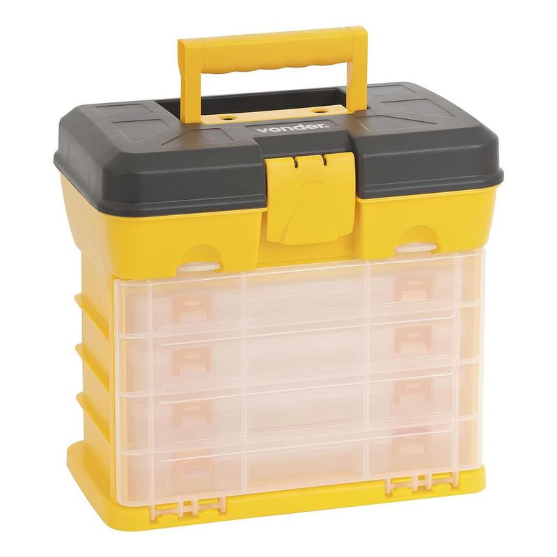 Possui: Alça para transporte, 4 bandejas móveis e 1 compartimento na tampa