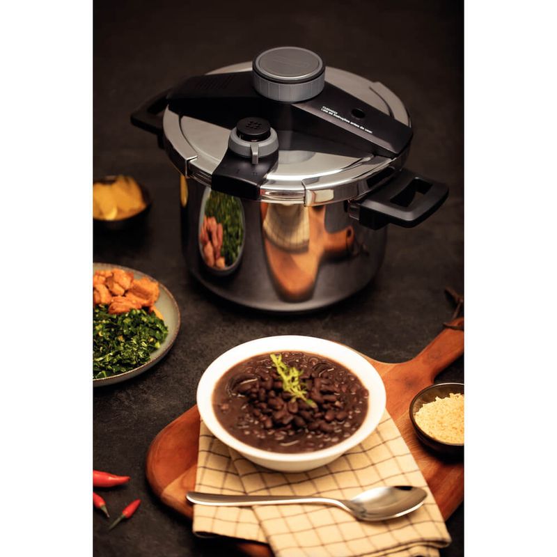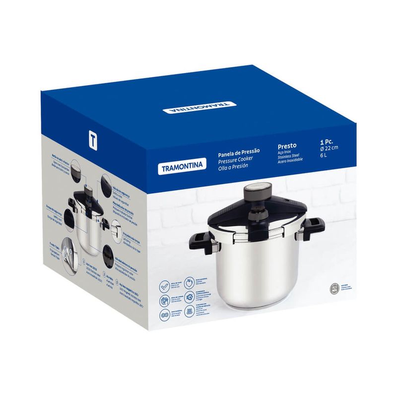 A panela de pressão Tramontina Presto em aço inox fundo triplo com 5 dispositivos de segurança 22 cm 6 L é perfeita para cozinhar de forma prática. Com um design moderno e estiloso, essa panela oferece funcionalidade e beleza em um único produto e vai transformar sua cozinha. Com um botão de abrir e fechar, escape e válvula de segurança, pino indicador de pressão, anel de vedação, e válvula seletora de pressão, ela é uma panela de pressão altamente segura e proporciona toda a eficiência que você merece. Seu fundo triplo proporciona uma distribuição uniforme do calor e garante o resultado perfeito das suas receitas. Cozinhe suas refeições com facilidade e segurança usando a Panela de Pressão Tramontina Presto, desfrutando de uma experiência culinária inigualável!