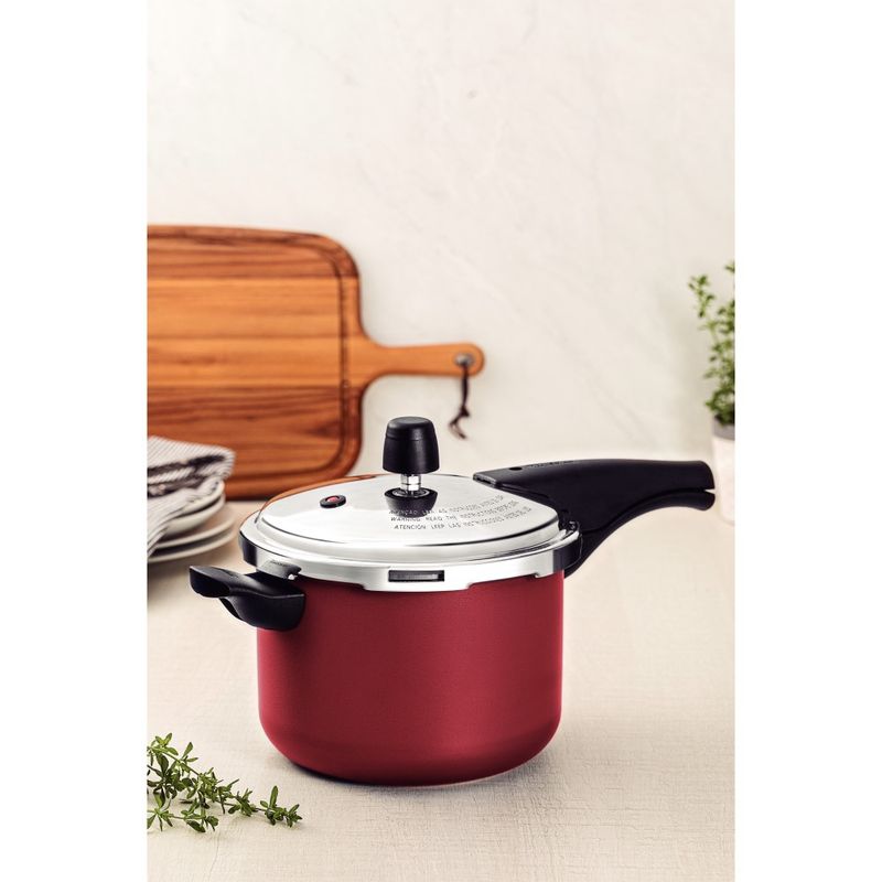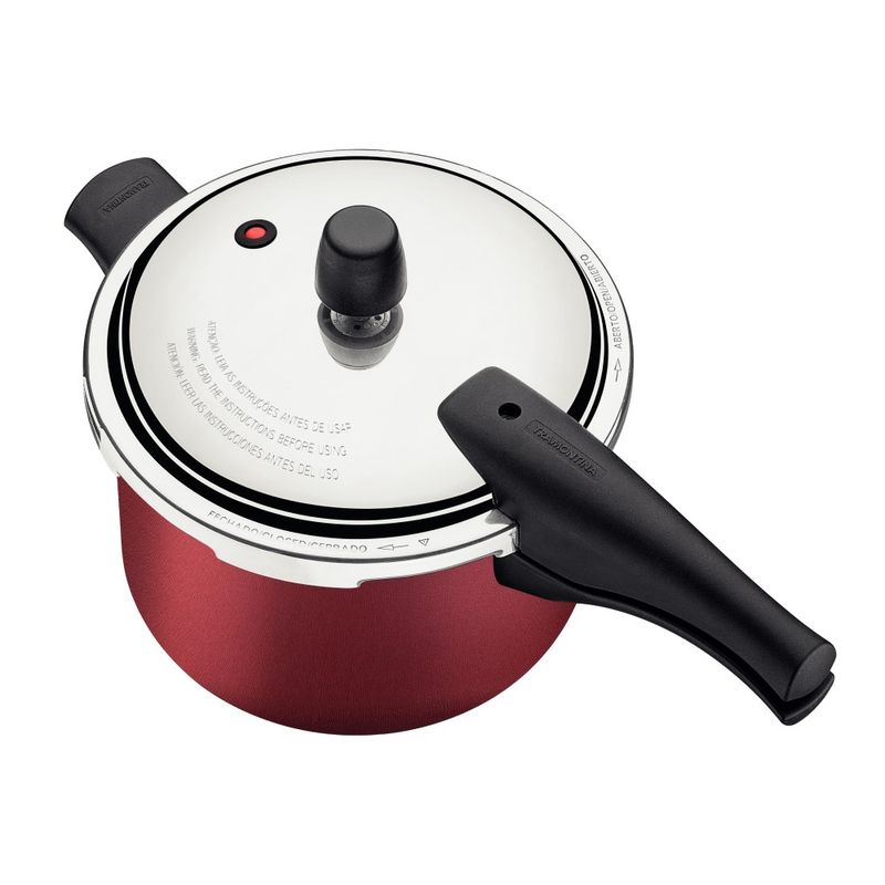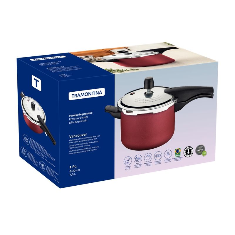 Já pensou em ter em sua cozinha uma panela de pressão eficiente, segura e resistente, que além de colorida e linda, também, não grude os alimentos? A Panela de Pressão Tramontina Vancouver em Alumínio com Revestimento Interno e Externo Antiaderente Starflon T1 Vermelha 20 cm 4,5 L é tudo isso e muito mais! Com um lindo revestimento interno e externo em antiaderente Starflon T1 na cor vermelha, ela será a estrela do seu fogão e vai dar um show na hora de cozinhar e de lavar. É uma panela que possui alça e cabo antitérmicos para facilitar o manuseio e três válvulas de segurança que oferecem maior segurança durante o uso. Com design exclusivo vai ser a protagonista da sua cozinha!