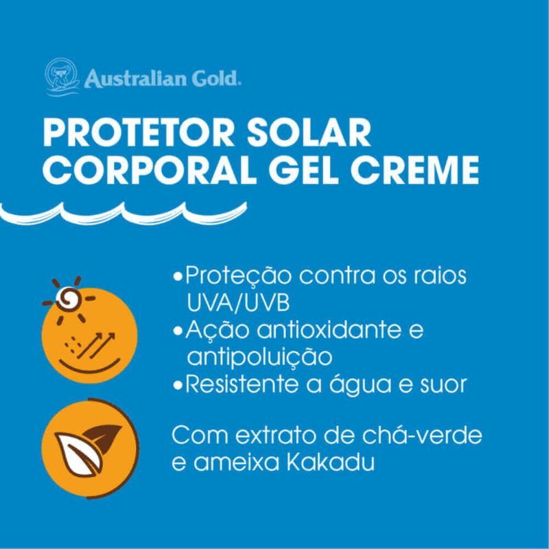 Protetor solar para todos os tipos de pele. Com toque seco e resistente à água, Australian Gold Gel Creme FPS 70 oferece ao corpo alta proteção contra os raios UVB/UVA, danos de poluentes e envelhecimento precoce.