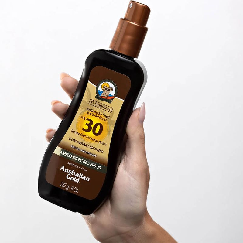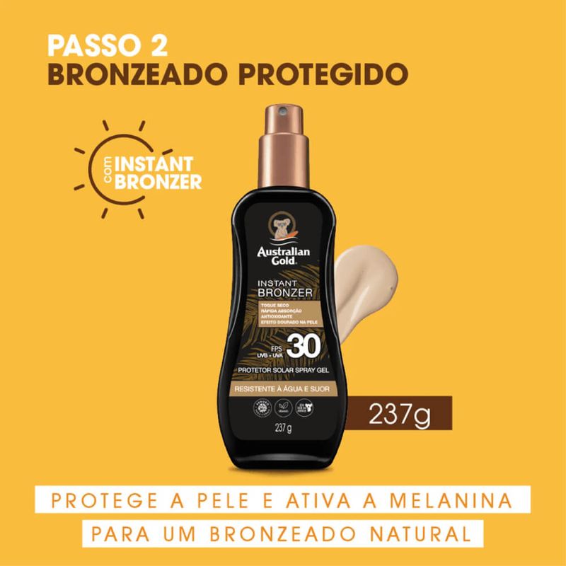 Protetor solar corporal em spray. Australian Gold Instant Bronzer FPS 30 protege a pele dos raios UVA e UVB e confere um bronzeado luminoso.