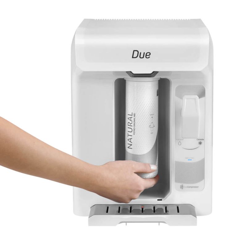 O Novo DUE é um purificador completo, com compressor ecológico que economiza energia e gela a água de verdade. Sua alavanca de acionamento permite escolher a temperatura da água e acionar sua saída no mesmo local. Além disso, possui o filtro NATURAL C+3, que retém impurezas, reduz o cloro livre, elimina sabores e odores indesejados e controla a proliferação de bactérias. É a solução ideal para famílias de até 7 pessoas, oferecendo leveza, purificação e refrigeração.