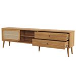 Por que escolher o Rack TB311? O destaque desta peça é sua porta deslizante com detalhe em tela natural (palhinha), uma super tendência na decoração que traz textura e elegância orgânica ao ambiente. Seus pés em madeira maciça garantem estabilidade e durabilidade superior, elevando o nível do acabamento.