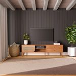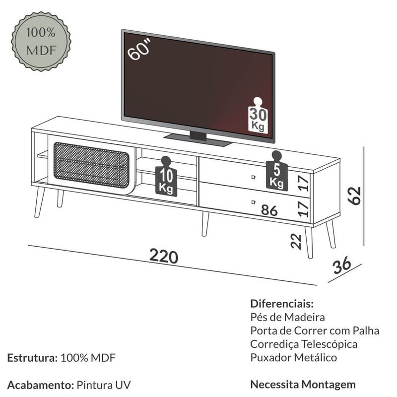 Funcionalidade para o Dia a Dia: Com 2,20m de largura, ele comporta com segurança TVs de até 75 polegadas. A organização fica por conta das 2 gavetas com corrediças telescópicas (que deslizam suavemente), além de nichos e prateleiras ideais para acomodar seus aparelhos eletrônicos e objetos decorativos favoritos.