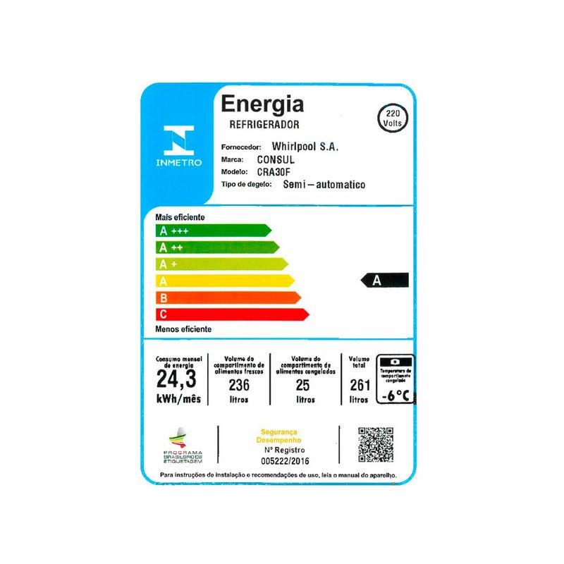 Com a tecnologia Cycle Defrost, a geladeira precisa ser descongelada apenas algumas vezes por ano, facilitando a manutenção. O refrigerador é classificado com eficiência energética A, com um consumo de apenas 24,3 kWh/mês, o que significa economia na sua conta de luz.