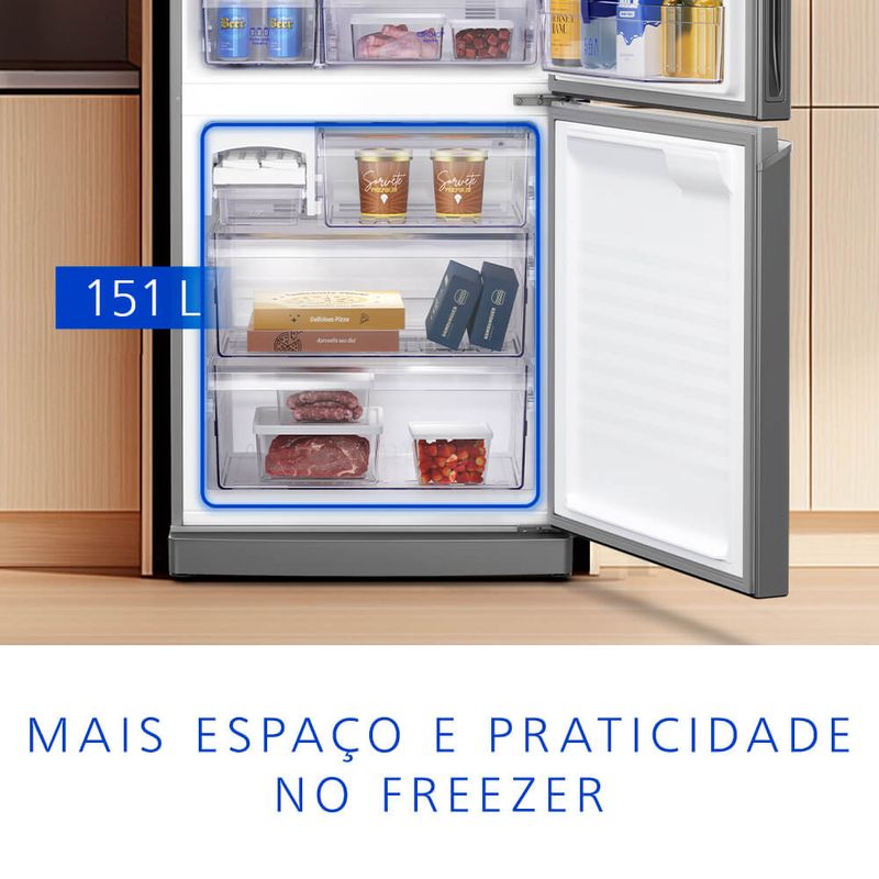 São 151 litros de capacidade no freezer e compartimentos em formato de gavetas, que facilitam a organização e o acesso aos alimentos.