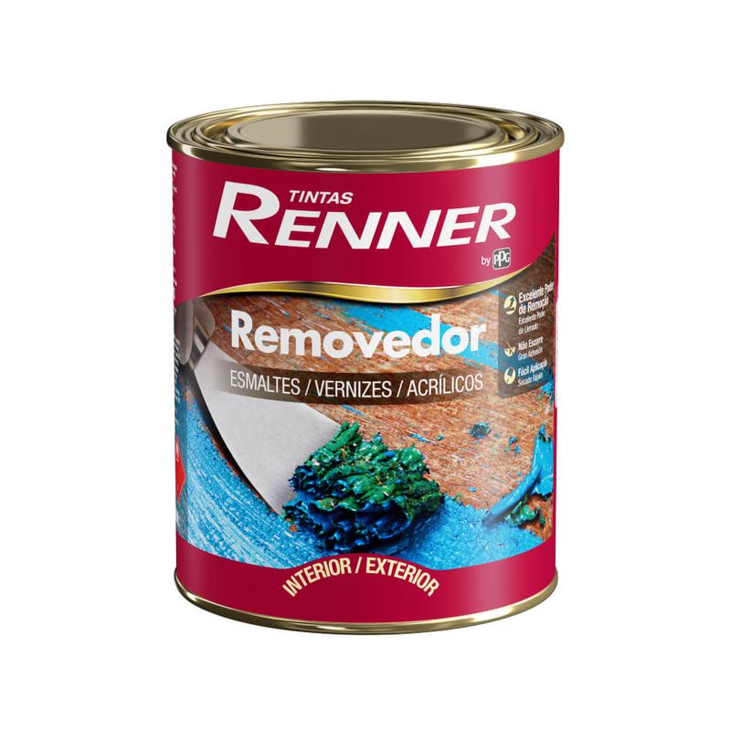 O Removedor Renner é um produto especialmente desenvolvido para facilitar o processo de pintura. Sua fórmula é moderna e age rapidamente sobre superfícies de madeira e metal, removendo películas de esmaltes, vernizes e acrílicos com máxima eficiência. Devido a sua alta viscosidade, não escorre quando aplicado em superfícies verticais.