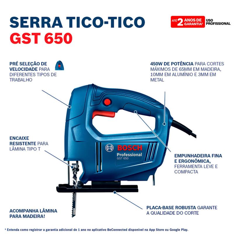 A Serra Tico-Tico Bosch GST 650, com potência de 450 W, é a ferramenta de entrada para quem procura por um produto profissional com excelente preço. Selecione a velocidade que quer trabalhar com a função de velocidade variável e a de pré seleção de velocidade. Troque lâminas de maneira simples e fácil através de um parafuso tipo allen, com suporte e cursor de lâmina robusto. Sua placa base possibilita regulagem de inclinação de até 45º - para a esquerda e para a direita - e é reforçada para os trabalhos mais rotineiros.