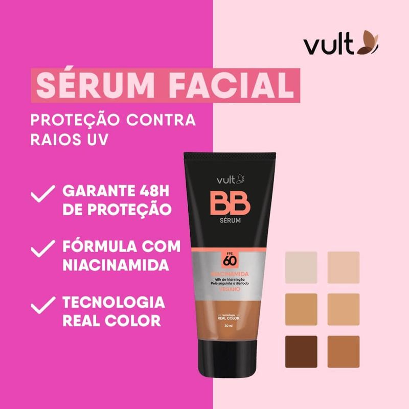 Quer um produto que hidrate, proteja e ainda dê uma cor que uniformize o tom da pele? Você vai adorar conhecer o Sérum Facial BB Cream FPS 60 V160! Este item multifuncional oferece vários benefícios ao mesmo tempo: