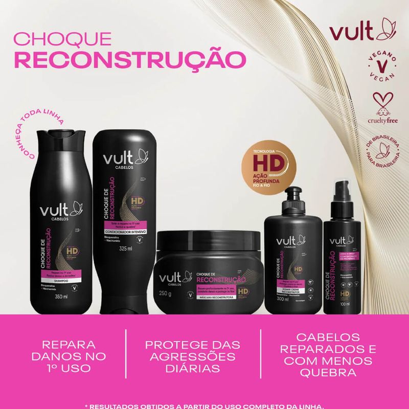 O Shampoo Vult Cabelos Choque de Reconstrução valoriza o cabelo e te incentiva a cuidar dos seus fios, manifestando a beleza única que eles têm. Quer fios reparados, com menos danos e cheios de brilho desde o 1º uso ¹ ? Vult Choque de Reconstrução te ajuda a tratar seu cabelo , exaltando suas singularidades! Com bioqueratina e niacinamida, este shampoo restaura a fibra capilar, reduz danos e protege contra agressores diários (sol, secador, processos químicos etc.). Conferindo limpeza instantânea sem ressecar , deixando seus fios alinhados e sem frizz, esse shampoo Vult tem mais benefícios: -pH 4,8 - 5,3; -Fragrância Floral Frutal; -Vegano, livre de sal², parabenos e petrolatos (óleo mineral e parafina). Com nova fórmula desenvolvida com Tecnologia HD , que é um sistema inteligente composto por aminoácidos reconhecidos pelo alto potencial reparador que agem profundamente fio a fio, a linha Vult Cabelos Choque de Reconstrução te deixa pronta e confiante para desbravar o mundo! SOBRE VULT CABELOS: Vult Cabelos celebra o orgulho de suas raízes e valoriza a potência do seu cabelo. Com linhas específicas para atender às suas necessidades, foi criada e desenvolvida para atender a todos os tipos de curvatura e suprir as necessidades diárias dos fios. Nenhum produto Vult é testado em animais, ou seja, este item possui selo Cruelty Free. ¹ Teste de força e de intensidade de áreas danificadas (Microscopia de Fluorescência) em mechas após a primeira aplicação da linha em comparação a mechas tratadas com shampoo sem agentes condicionantes. Resultados obtidos a partir do uso completo da linha Vult Choque de reconstrução. ² Sem adição de cloreto de sódio.
