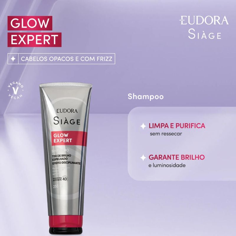 O Shampoo Siàge Glow Expert limpa os fios sem ressecar, garantindo brilho intenso e luminosidade para seus cabelos. Eudora Siàge buscou nos alpes suíços um ativo raro e inovador, para inspirar e trazer brilho revolucionário. Sua fórmula contém Flor de Geleiras que recria o banho gelado nos fios para um brilho espelhado, e Glossfix , componentes que fixam o brilho no cabelo e aumentam a durabilidade do tratamento. Ideal para cabelos opacos que sofrem com fios indisciplinados e frizz , entrega um verdadeiro resultado de salão para a sua rotina. SOBRE A LINHA Siàge Glow Expert buscou nos alpes suíços um ativo raro e inovador e adicionou um blend de ingredientes para chegar em uma fórmula única e exclusiva, que entrega brilho revolucionário por 72 horas , fios polidos e disciplinados , sem deixar os cabelos com aspecto oleoso ou pesado. Nenhum produto Eudora é testado em animais, ou seja, este item possui selo Cruelty Free.