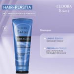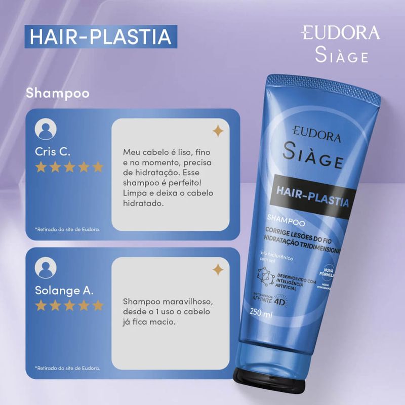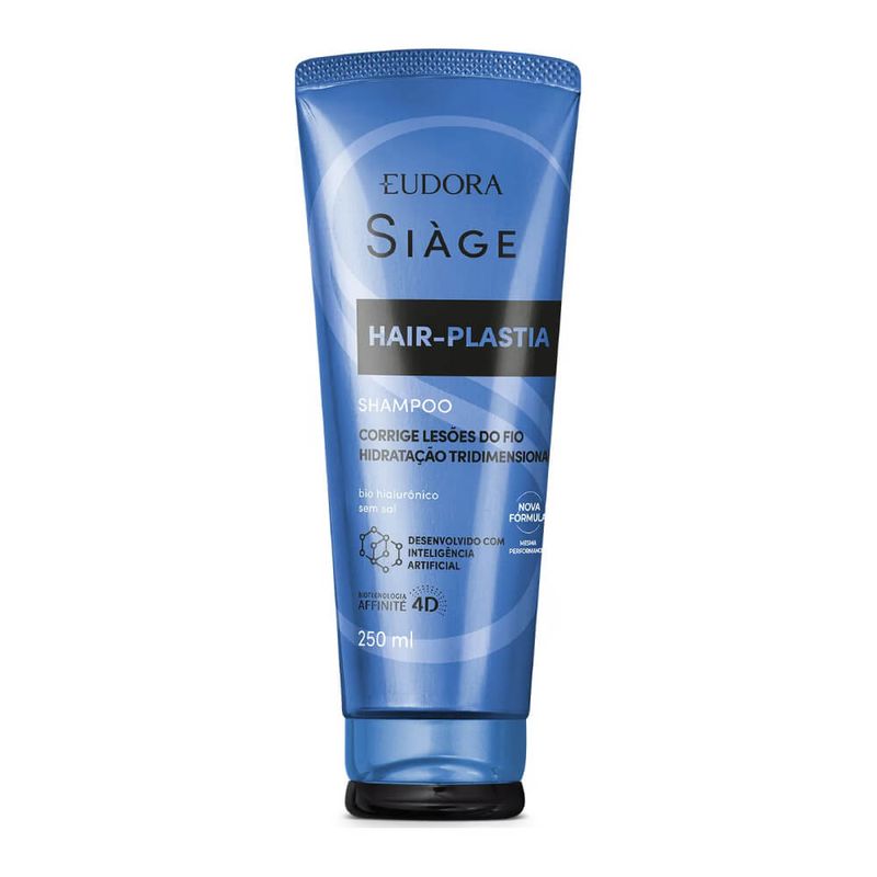 Hair-Plastia é a linha mais tecnológica Siáge, atuando diretamente na estrutura do fio para promover uma verdadeira plástica capilar e corrigir as lesões do cabelo. Livre de Parabenos, Petrolatos, Corantes e Sal, o Shampoo Hair-Plastia limpa e elimina resíduos suavemente, sem ressecar as madeixas. Com Bio Hialurônico em sua fórmula, este shampoo eudora oferece hidratação tridimensional, que age em todas as camadas do fio, devolvendo vida e densidade ao seu cabelo. Benefícios: Melhora a qualidade do cabelo desde o 1º uso; Fios mais encorpados desde a 1ª aplicação; Age de dentro para fora, preenchendo a fibra capilar; Cabelos extremamente macios e brilhantes. Saiba mais sobre a linha Siàge Hair-Plastia: Desenvolvido com Inteligência Artificial e Bio Hialurônico, Siàge Hair-Plastia é tecnologia para o seu melhor cabelo, todos os dias. A Inteligência Artificial combinou milhares de dados e estudou o comportamento das pessoas para atender com precisão as necessidades das consumidoras. Nenhum produto Eudora é testado em animais. Ingredientes atualizados na data desta publicação. Mas é importante lembrar de sempre verificar a embalagem, a informação mais atual é a do rótulo do produto.
