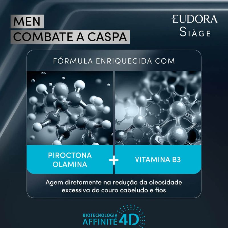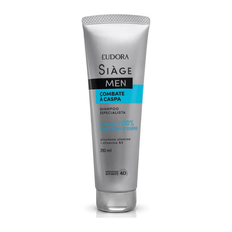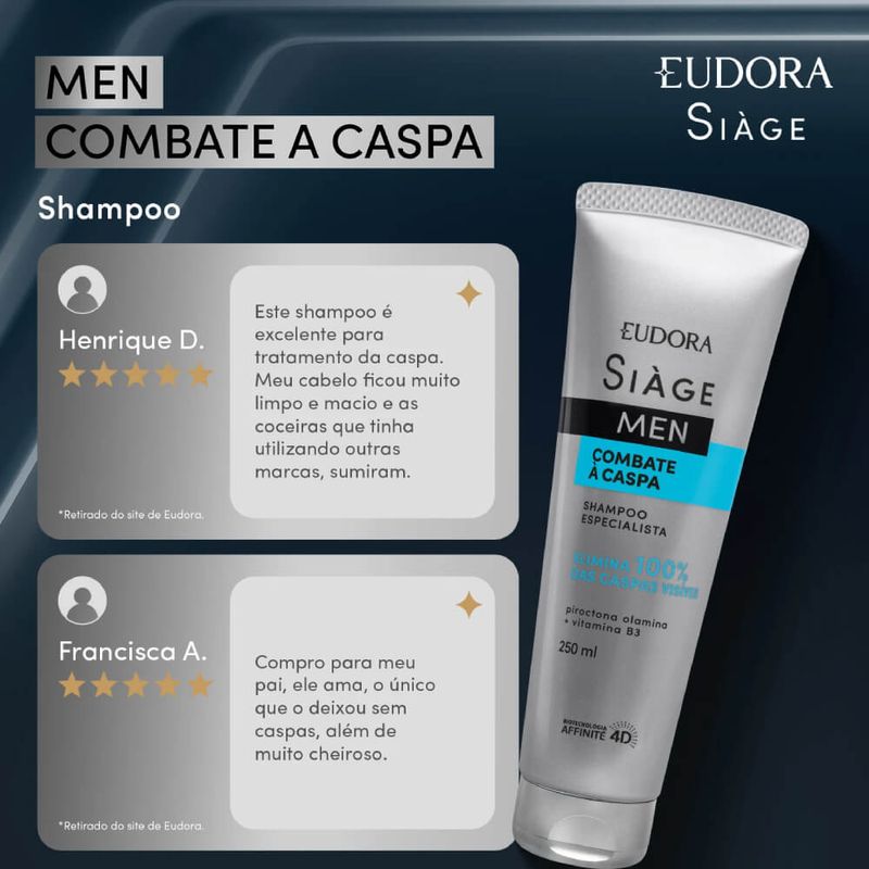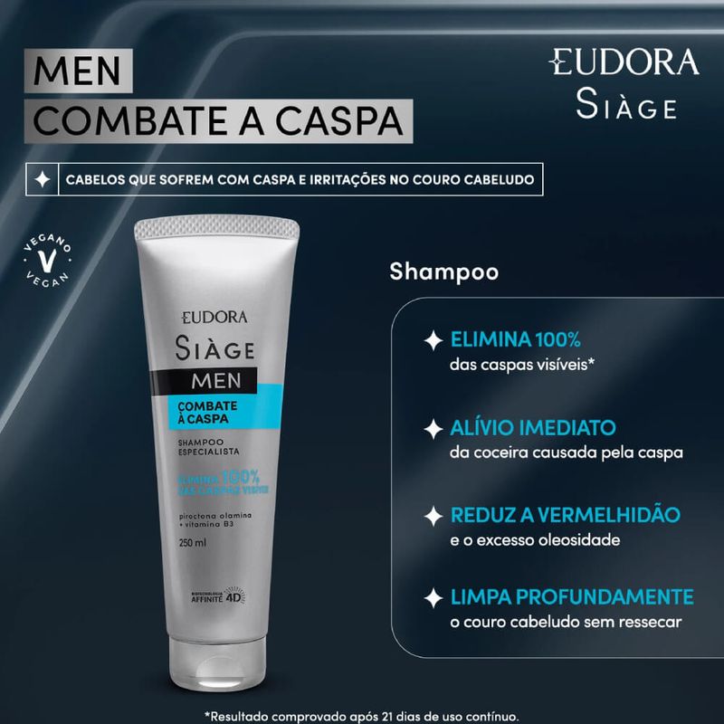 O Shampoo Siàge Men Combate à Caspa entrega fios saudáveis e livres do excesso de oleosidade, para cabelos livres de caspa e bem cuidados. Ideal para cabelos que sofrem de caspa, sua fórmula limpa profundamente sem ressecar os fios , reduz a caspa no cabelo* e alivia a coceira, de forma imediata. Eudora Siàge Men é a linha especialista no cabelo do homem. Sua formulação enriquecida com a Biotecnologia Affinité 4D, que atua diretamente no equilíbrio e proteção das características naturais do couro cabeludo, trazendo cuidado completo ao fio . Sua fórmula com Piroctona Olamina e Vitamina B3, entrega um shampoo especialista que age diretamente na redução da oleosidade excessiva do couro cabeludo e dos fios, contribuindo para eliminação da caspa Confira os benefícios desse shampoo anticaspa: -Elimina 100% das caspas visíveis*; -Alívio imediato da coceira causada pela caspa; -Reduz a vermelhidão do couro cabeludo causado pela caspa*; -Limpa profundamente o couro cabeludo sem ressecar; -Reduz a oleosidade excessiva do couro e cabelos. SOBRE A LINHA Siàge Men é uma linha especialmente desenvolvida para tratamento e cuidado dos cabelos masculinos . Oferece tratamentos completos com tecnologia avançada, que entregam alta performance para o cabelo e com um tratamento profissional de salão em casa. *Resultado comprovado após 21 dias de uso contínuo. Nenhum produto Eudora é testado em animais, ou seja, este item possui selo Cruelty Free.