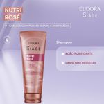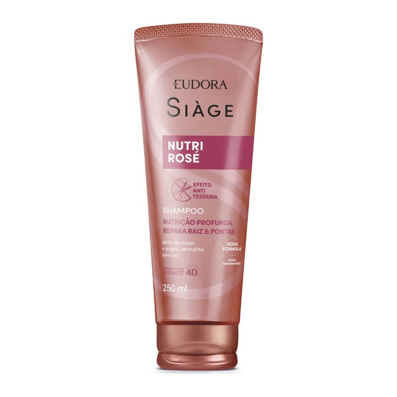 O Shampoo Siàge Nutri Rosé prepara seus fios para um resultado de salão dentro da sua rotina. Conta com ação purificante e limpa profundamente, sem ressecar os fios . A linha apresenta o efeito anti-tesoura : Não será mais preciso recorrer ao corte para ter cabelos lindos e saudáveis! Benefícios do uso da linha completa: -Nutrição profunda até a 3ª camada do fio; -Reparação instantânea e duradoura, sem pesar; -Raiz saudável e comprimento livre de pontas duplas. Enriquecido com um poderoso Elixir de Rosas , um ativo poderoso obtido através da colheita de 30 mil pétalas de rosas que garante a reparação dos fios por inteiro, é também rico em vitaminas e antioxidantes que nutrem os fios e tem alto poder de reparação. Combinando Argila Vermelha , o uso da linha completa nutre os fios , promove equilíbrio ao couro cabeludo e reparação profunda, da raiz às pontas. Siàge Nutri Rosé, a nova linha de Siàge que chegou para você dizer adeus às tesouras! Nenhum produto Eudora é testado em animais, ou seja, este item possui selo Cruelty Free.