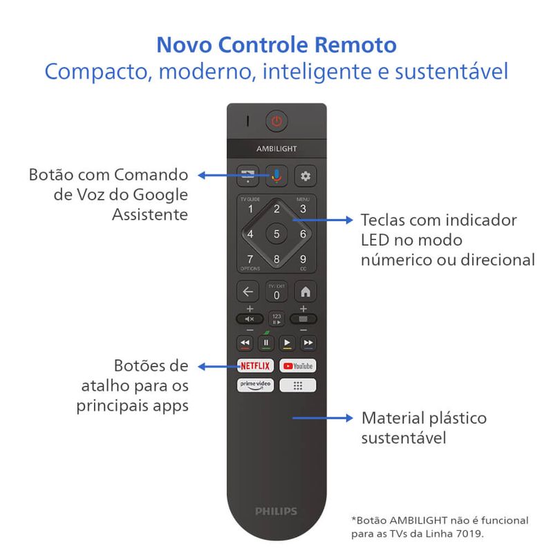Características do controle remoto: Comando de Voz c/ Google Assistant, Botões de atalho Netflix, Youtube e Prime Video