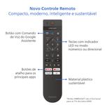 Características do controle remoto: Comando de Voz c/ Google Assistant, Botões de atalho Netflix, Youtube e Prime Video