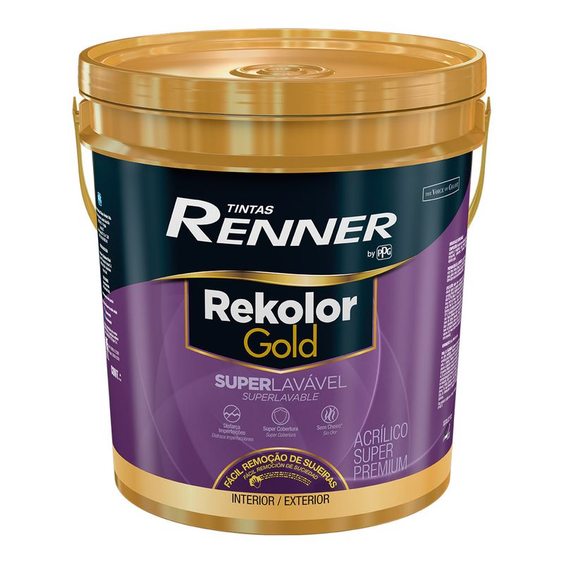 Rekolor Gold é uma linha de acrílicos premium que oferece performance superior comparada com os acrílicos convencionais. A versão SUPERLAVÁVEL proporciona um acabamento Eggshell, com um nível de brilho entre o fosco e o acetinado, ajudando a disfarçar as imperfeições da parede. Permite uma fácil remoção de sujeiras, tais como manchas de chocolate, ketchup, café, refrigerantes, sucos, lápis, caneta hidrográfica, lápis de cor, giz de cera, sangue de pernilongo e batom. Possui ótimo rendimento e baixíssimo odor. Indicado para ambientes internos e externos, em superfícies de alvenaria em geral, massa corrida, massa acrílica, reboco, concreto, fibrocimento, cerâmica não vitrificada, gesso e texturas.