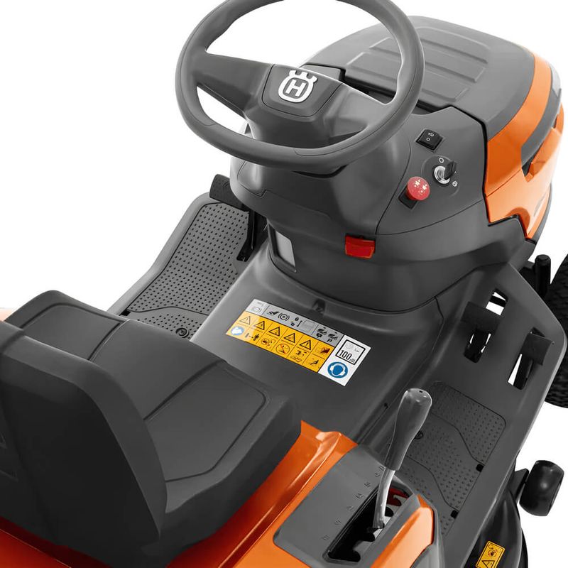 Posição de condução e funcionamento confortáveis graças ao banco ajustável e aos controlos de fácil acesso. Ajuste da altura de corte assistido por mola para uma regulação fácil da altura pretendida.