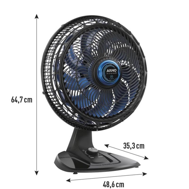 Máximo alcance, mínimo ruído! Imbatível contra o calor e mosquitos, O novo Ventilador X-treme 9 Repelente Líquido de Mesa 40cm é o único com o Exclusivo Sistema de Repelente Líquido, que garante proteção para sua família contra insetos, mosquitos da Dengue, Chikungunya e Zika vírus. A ação conjunta com o sistema de ventilação aumenta a área de difusão do repelente, apresentando maior eficiência contra mosquitos do que o aparelho elétrico de mesa. O refil é localizado no centro da grade, sendo fácil de trocar e aceita todos os frascos de repelentes disponíveis no mercado. Possui grande eficácia de uso, com longa duração de até 70 noites sem precisar trocar o refil. Possui também a tecnologia única que tem a melhor combinação de máximo vento com conforto sonoro. Potência + X-treme Silêncio que deixa os ambientes muito mais agradáveis e refrescantes. Com longo alcance de ar de até 12* metros o Ventilador X-treme 9 conta com a Power Zone**, uma área concentrada que garante o máximo de vento direcionado, oferecendo performance superior para que você não sofra com o calor e possui a exclusiva grade Chevron Zone que proporciona um conforto muito maior do som. Máximo alcance de vento, extremamente potente com 9 pás e 3 Velocidades ou 3 Velocidades + Função Repelente que atendem a cada necessidade: - Velocidade 3 - Potência Extrema: o vento mais forte com o menor ruído do mercado para alívio imediato do calor; - Velocidade 2 - Eco Fresh: até 20%*** mais econômica, para deixar o ventilador ligado durante todo o dia sem preocupação; - Velocidade 1 - Sono tranquilo: vento moderado, super silencioso para uma noite de sono tranquila. Design moderno, fácil de montar, transportar e desmontável para armazenar quando não estiver em uso, versátil com 80° de oscilação horizontal e 4 inclinações verticais. A linha X-treme 9 conta com a máxima tecnologia para levar eficiência, praticidade e economia para o seu dia a dia sempre com muita segurança e durabilidade. Novo Ventilador Arno X-treme 9 Mesa Repelente 40cm: Máximo alcance, mínimo ruído! Você imagina, clic, a Arno faz.