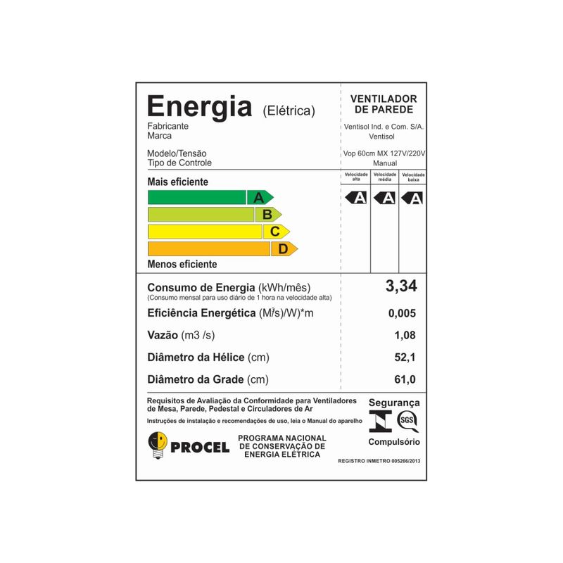 Com 60 cm de diâmetro de grade, o Ventilador de Parede Ventisol conta com hélices em plástico de engenharia. Além de fortes, são leves e aumentam a vida útil do motor, que entrega 200W de potência para um fluxo de ar superior. A oscilação horizontal proporciona um fluxo de ar melhor distribuído por todo o ambiente, enquanto a regulagem de inclinação manual permite ajustar o ângulo conforme a necessidade.